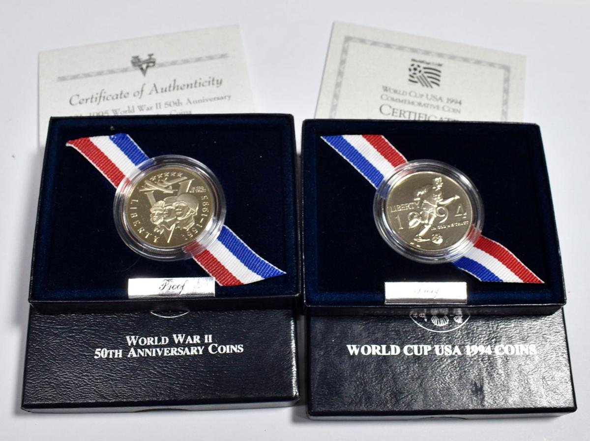 English USA. Set of 2 1/2 dollar coins commemorating the 50th Anniversary of World War II and the 1994 USA Soccer World Cup. Both in cupro-nickel and minted by the Philadelphia mint. Presented in original box with certificate of authenticity. TO EXAMINE.