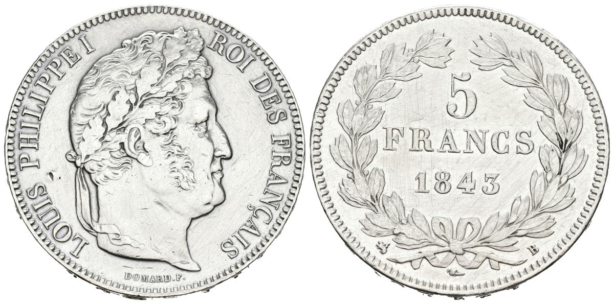 English FRANCE. 5 Francs (Ar. 25.03g / 37mm). 1843. Luis Felipe I. Rouen B. (Km # 749.2). Good Very Fine. Scratch .