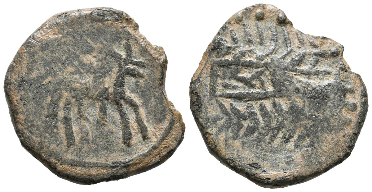 English LASTIGI (Near Aznalcóllar, Sevilla). Semis. (Ae. 7.89g / 26mm). 150-50 BC (FAB-1678). Anv: Rider to the right. Rev: Two spikes on the left, including a legend on the cartouche: LASTIGI. Almost Very Fine. Missing flange.