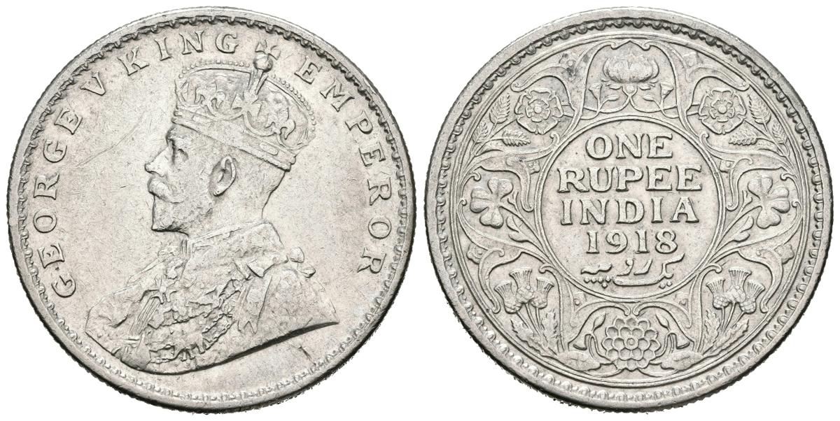 INDIA (British). 1 Rupee (Ar. 11.57g / 31mm). 1918. Jorge V. Calcutta. No mint mark. (Km # 524). Good Very Fine. Cleaned.