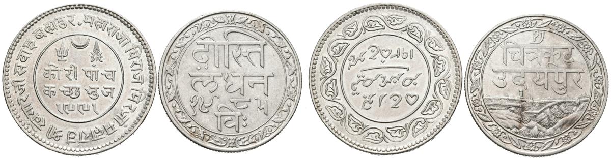 INDIA. Interesting set consisting of 2 silver coins of 5 Kori (Kutch) and 1 Rupee (Newar) minted in 1934 and 1928 respectively. High degree of conservation. TO EXAMINE.