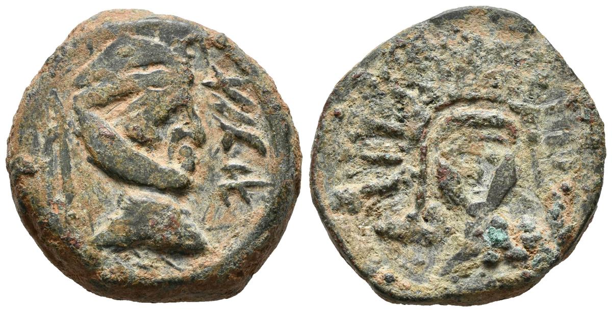 MALACA (Malaga). As. (Ae. 14.29g / 26mm). 200-20 BC (FAB-1726). Anv: Head of Vulcan to the right, front Punic legend type A, behind pincers. Rev: Head of Helios from the front. Very Fine.