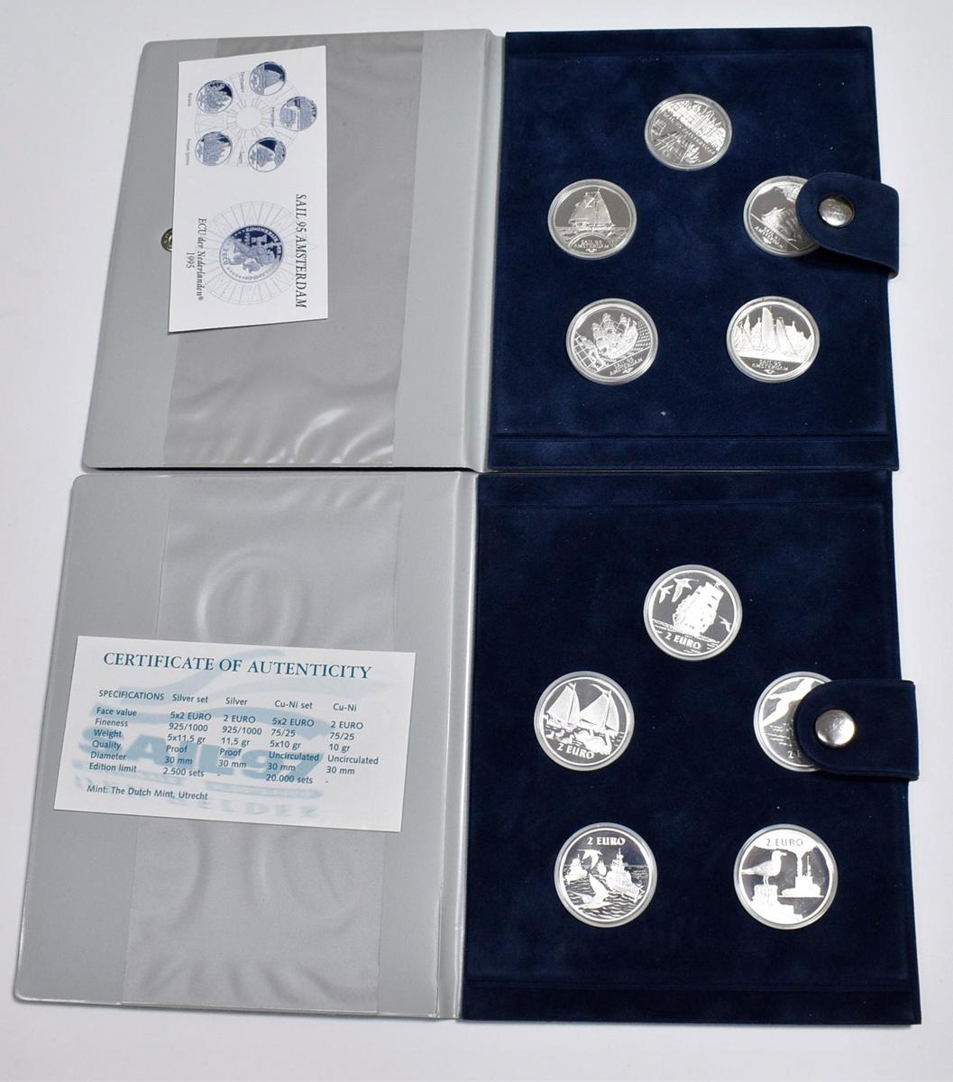 NETHERLANDS. Set of 2 sets consisting of 10 silver coins of 2 ECU and 2 Euro minted in 1995 and 1997. Utrecht. Maritime theme. Uncirculated. Includes original box and certificate of authenticity.