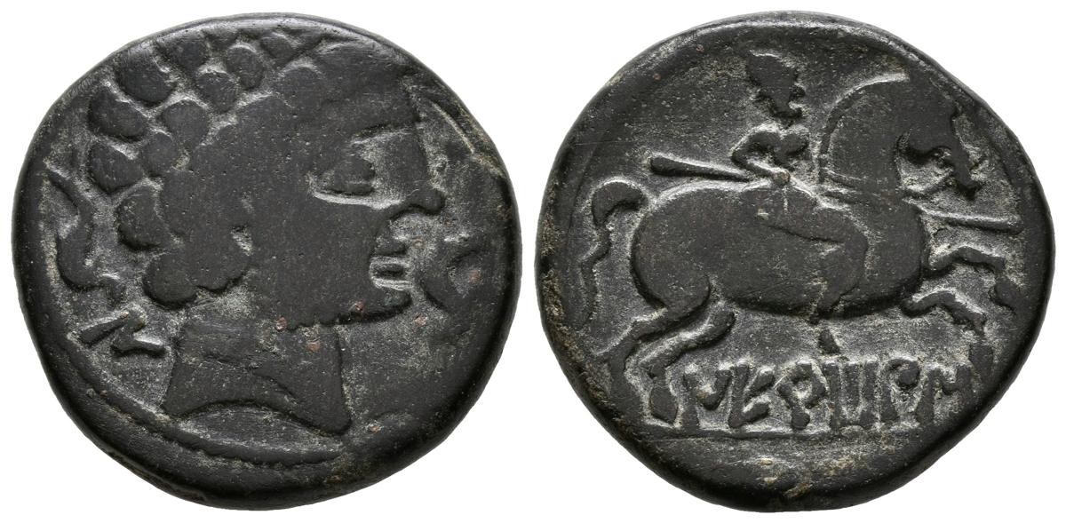 English NERTOBIS (Calatorao, Zaragoza). As. (Ae. 8.94g / 23mm). 120-20 BC (FAB-1772). Anv: Bearded male head to the right, between two dolphins, behind Iberian letter: N. Rev: Rider with spear to the right, below Iberian legend: NERToBiS. Almost Very Fine. Scarce