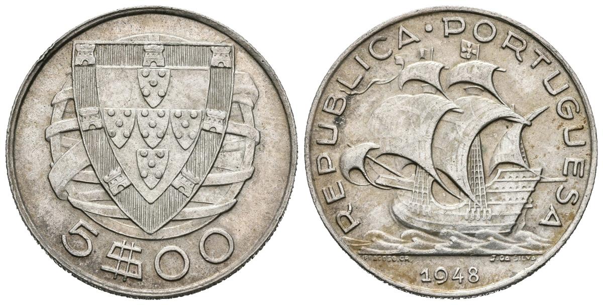 English PORTUGAL. 5 Escudos. (Ar. 6.96g / 25mm). 1948. (Gomes 35.10). Uncirculated.