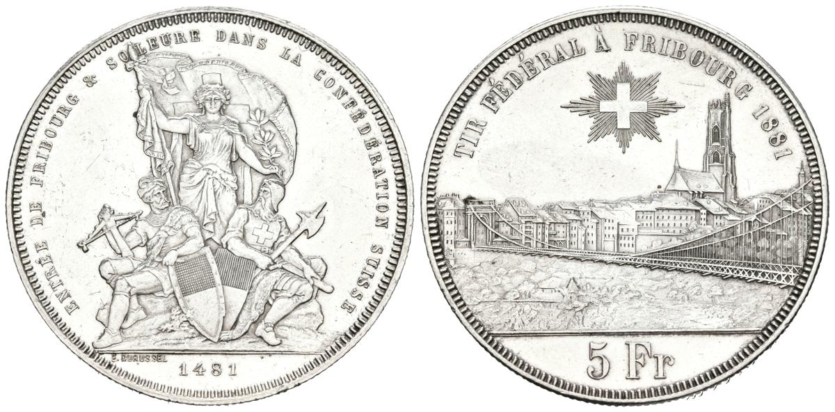 SWITZERLAND (Swiss Confederation). 5 Francs (Ar.25.00g / 37mm). 1881. Freiburg. Freiburg Shooting Festival. (Km # S15). Good Very Fine. Scratch .