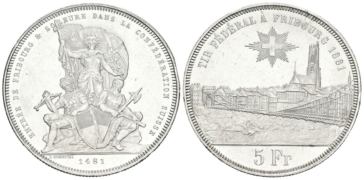 English SWITZERLAND (Swiss Confederation). 5 Francs (Ar.24.97g / 37mm). 1881. Freiburg. Freiburg Shooting Festival. (Km # S15). Good Very Fine. Scratch .