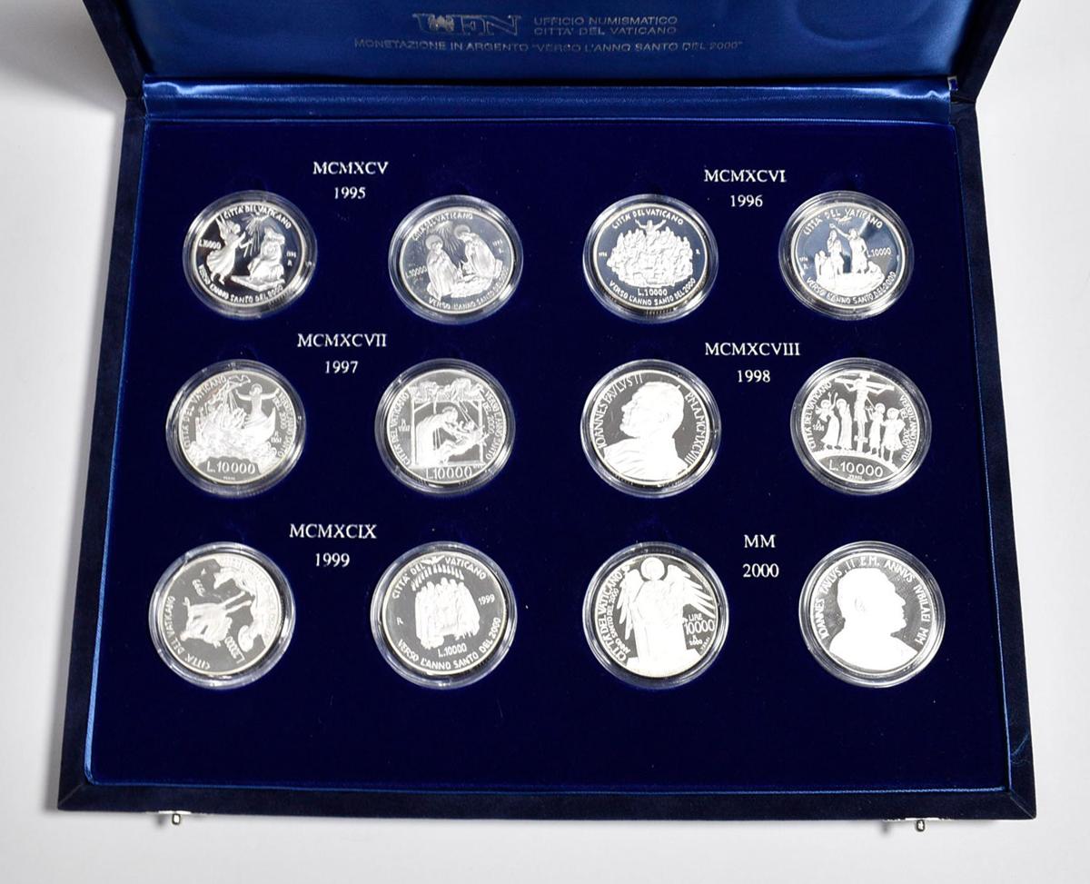 VATICAN. Official commemorative case Towards the Holy Year of 2000. The set consists of 12 coins of 10,000 lire in silver of 0.835 minted between 1995 and 2000. Average weight and size per coin: 22g / 34mm. Minted by UFN (Ufficio Numismatico Citta del Vaticano). PROOF. Includes original box and certificates of authenticity.