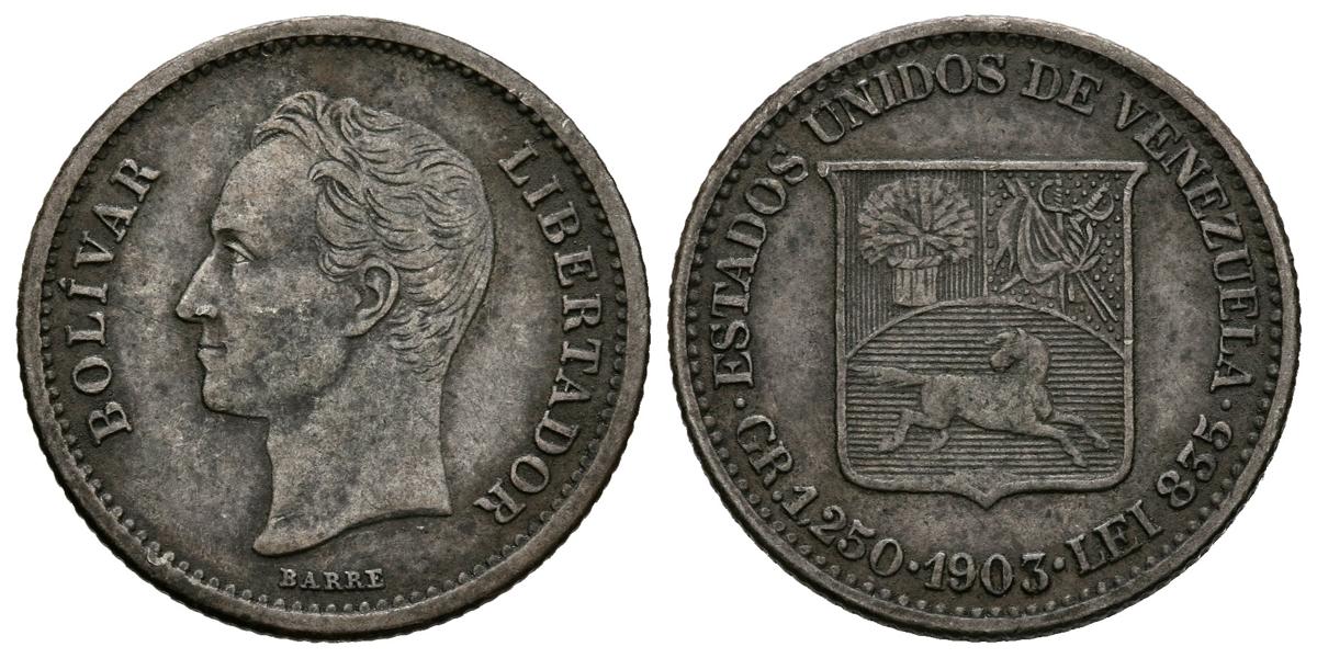 English UNITED STATES OF VENEZUELA. 1/4 Bolivar. (Ar. 1.25g / 15mm). 1903. Philadelphia. (Km # Y20). Good Very Fine.