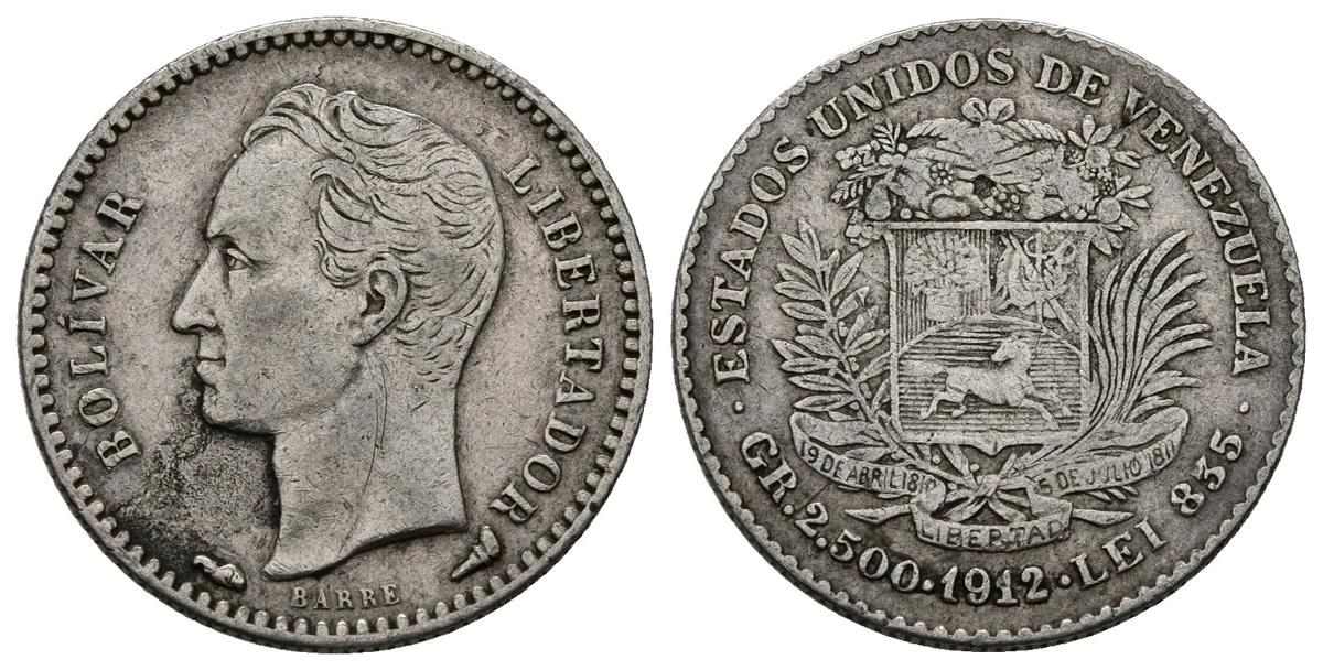 English UNITED STATES OF VENEZUELA. 1/2 Bolivar. (Ar. 2.47 / 18mm). 1912. Paris. (Km # Y21). Very Fine.