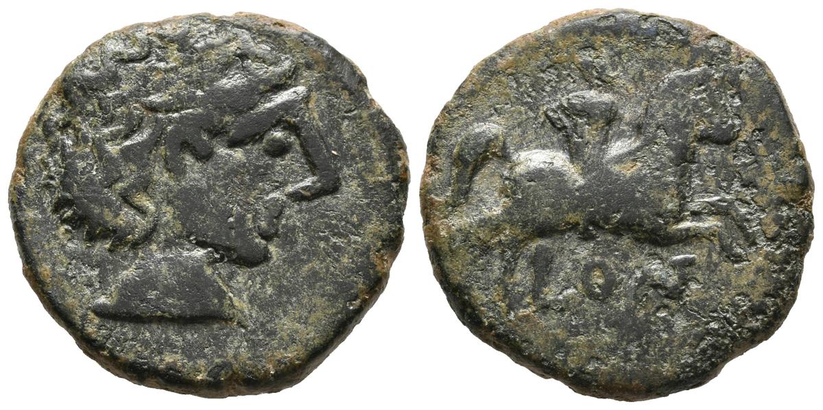 English OLONT (Aznalcázar, Sevilla). As. (Ae. 9.21g / 22mm). 50-20 BC (FAB-1877). Anv: Male head to the right. Rev: Rider on the right, below legend: LONT. Very Fine.