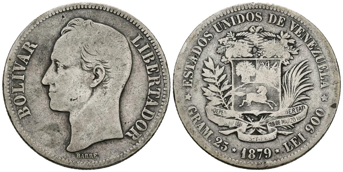 English UNITED STATES OF VENEZUELA. 5 Bolivars. (Ar. 24.20g / 37mm). 1879. Brussels. (Km # Y24.1). Almost Very Fine.