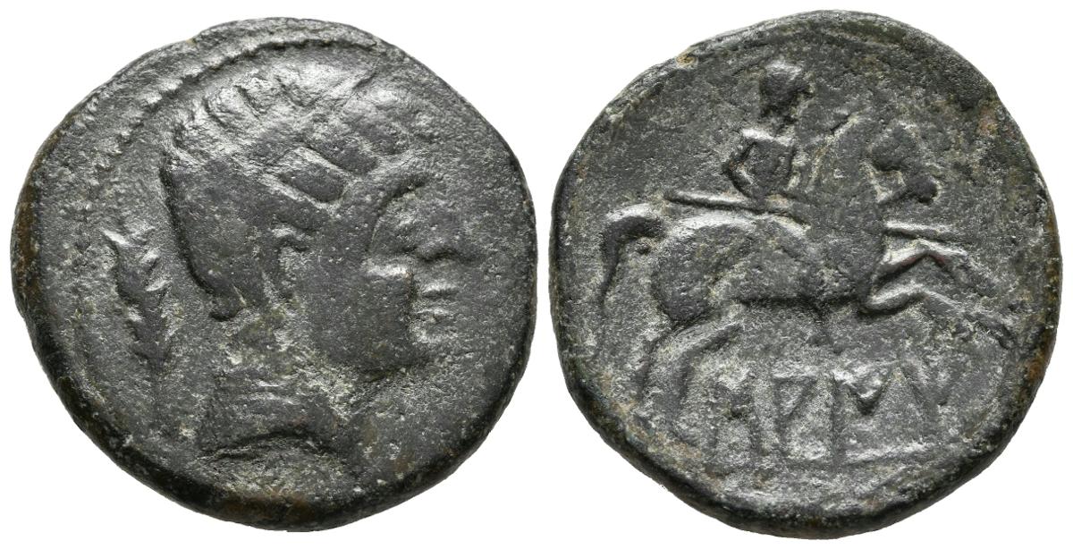 SAITI (Xátiva, Valencia). As. (Ae. 12.30g / 28mm). 120-20 BC (FAB-2097). Anv: Male head to the right, behind scepter. Rev: Rider with palm to the right, below Iberian legend: SAITi. Almost Very Fine.