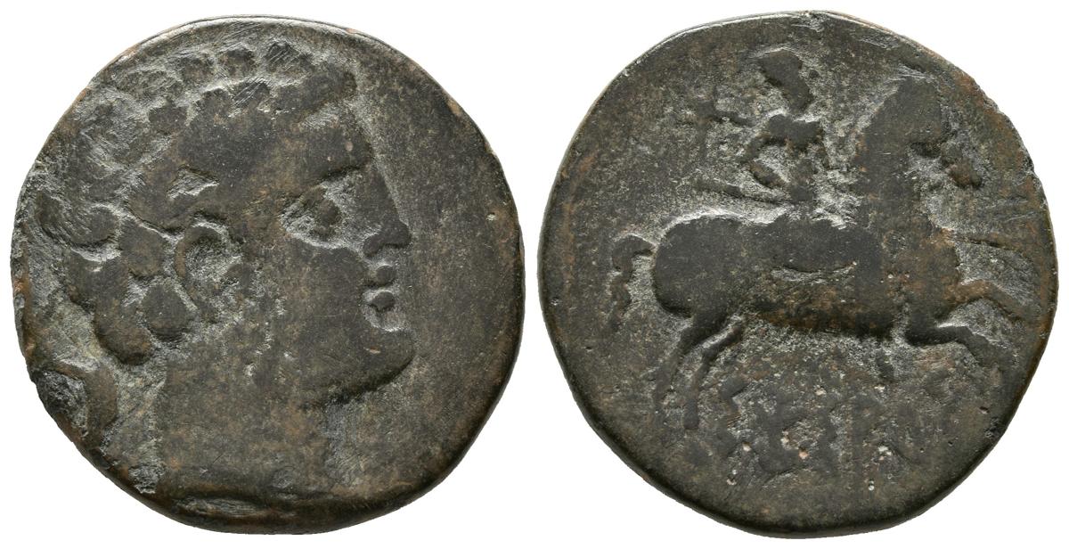 SESARS (Area of Aragon). As. (Ae. 8.82g / 25mm). 120-20 BC (FAB-2199). Anv: Bearded male head to the right, behind dolphin. Rev: Rider with spear to the right, above star, below Iberian legend: SESARS. Almost Very Fine.