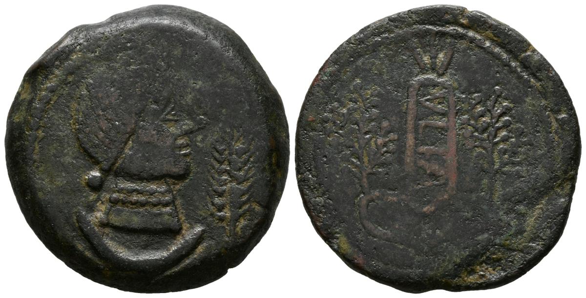 ULIA (Montemayor, Córdoba). As. (Ae. 18.82g / 31mm). 50 bC (FAB-2490). Anv: Female head to the right, palm in front, crescent below. Rev: Vine branches around border with legend: VLIA. Good Fine.