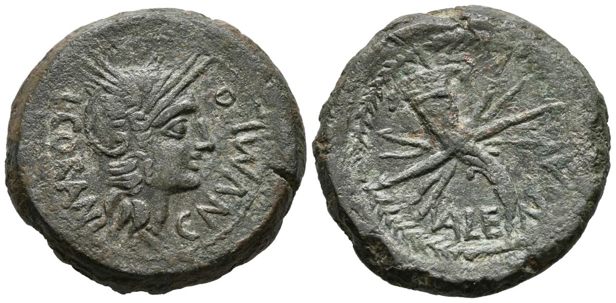 VALENTIA (Valencia). As. (Ae. 23.93g / 31mm). 150-50 BC (FAB-2511, heavy series). Obv: Galley head of Rome to right, around legend: L CORANI C NVMI. Rev: Cornucopia on fulmen inside laurel wreath, below legend: VALENTIA. Good Very Fine. Scarce and beautiful specimen.