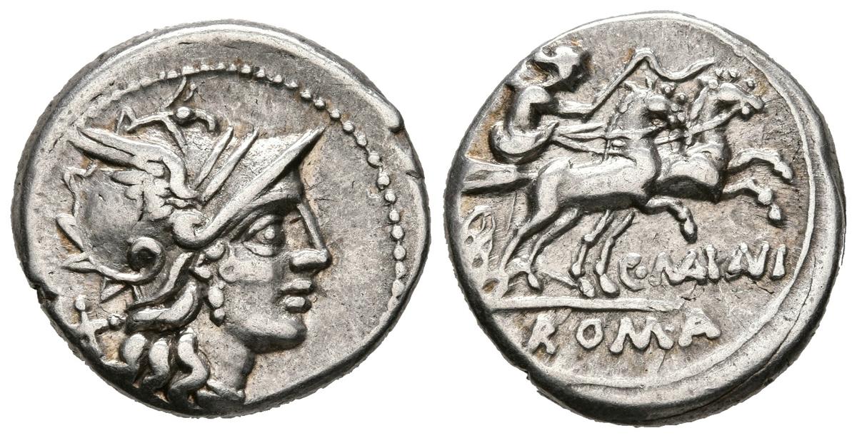 English GENS TOMORROW. Denarius. (Ar. 4.05g / 18mm). 153 BC Rome. (FFC 832; Crawford 203 / 1a). Anv: Head of Rome to the right, behind X. Rev: Victory with a whip in biga to the right, below legend: C MAIANI, in exergue: ROMA. Very Fine.