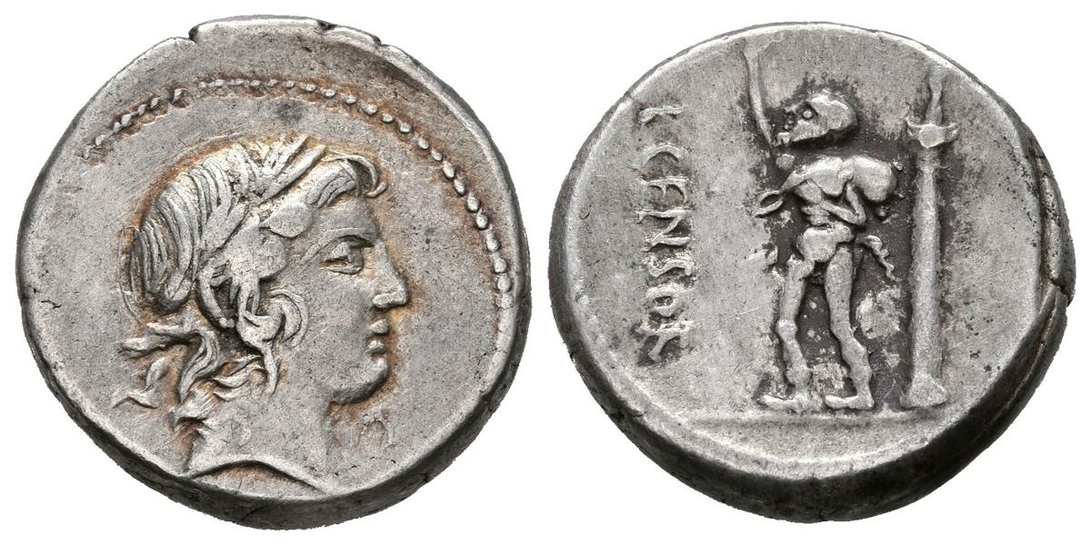 English GENS MARCIA. Denarius. (Ar. 4.12g / 18mm). 88 BC Rome. (FFC 888; Crawford 363 / 1d). Anv: Laureate head of Apollo on the right. Rev: Satyr Marsyas standing left, behind column mounted by statue, behind legend: L CENSOR. Good Very Fine. Slight iridescent tone.