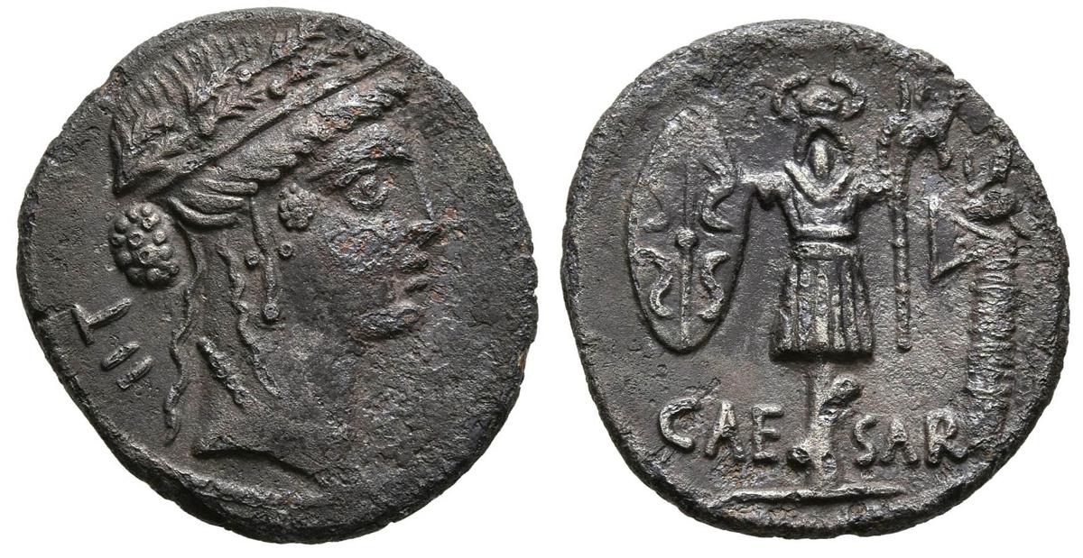 English JULIUS CAESAR. Denarius lined. (Ae. 2.89g / 19mm). 48-47 BC Gaul. (FFC 14; Crawford 452/2). Anv: Laureate and diademic head of the Pietà on the right, behind LII. Rev: Trophy with oval shield and carnyx on the right ax, below legend: CAESAR. Good Very Fine.