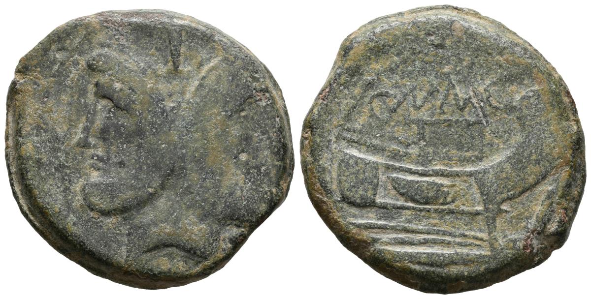 POMPEY, the Great. As. (Ae. 24.27g / 31mm). 45 BC (Crawford 471/1). Anv: Double-faced Janus head, above I. Rev: Bow to the right, below legend: IMP, above: CN MAG. Almost Very Fine. Scarce