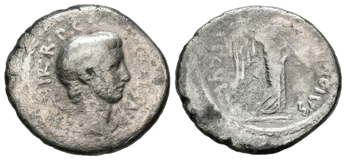 OCTAVIO. Denarius. (Ar. 3.26g / 18mm). 42 BC Rome. (Crawford 494/25). Anv: Head of Octavio to the right, around legend: C CAESAR III VIR RP C. Rev: Victoria standing to the right wearing laurel wreath and palm, around legend: L LIVINEIVS REGVLVS. Good Fine. Rare specimen.