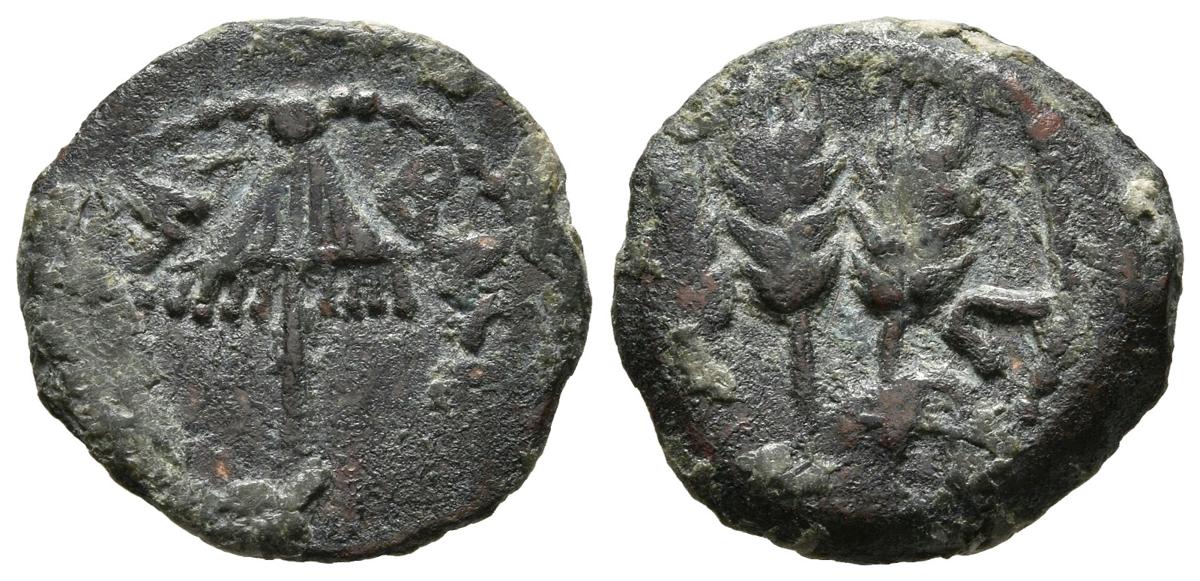 JUDAEA, Agrippa I. Prutah. (Ae. 2.39g / 17mm). 37-44 AD Jerusalem. (Seaby 5567). Anv: Canopy in the shape of an umbrella, around legend. Rev: Three spikes, around legend. Very Fine.
