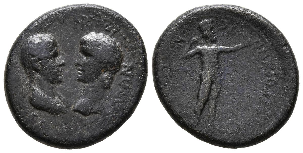 English NERON with AGRIPINA. Be20. (Ae. 4.43g / 20mm). 54-68 AD Phrygia. (RPC 3107). Anv: Busts of Nero and Agrippina facing each other, around Greek legend. Rev: Apollo standing to the right with bow, around Greek legend. Almost Very Fine.