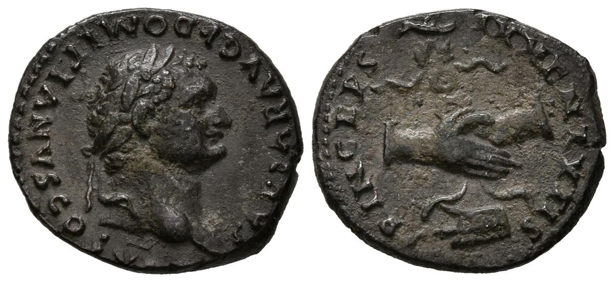 English DOMITIAN. Denarius. (Ar. 3.06g / 18mm). 79 AD Rome. (RIC 1081). Anv: Laureate head of Domitian on the right, around legend: CAESAR AVG F DOMITIANVS COS V. Rev: Hands intertwined with an eagle on the prow, around legend: PRINCEPS IVVENTVTI. Good Very Fine.