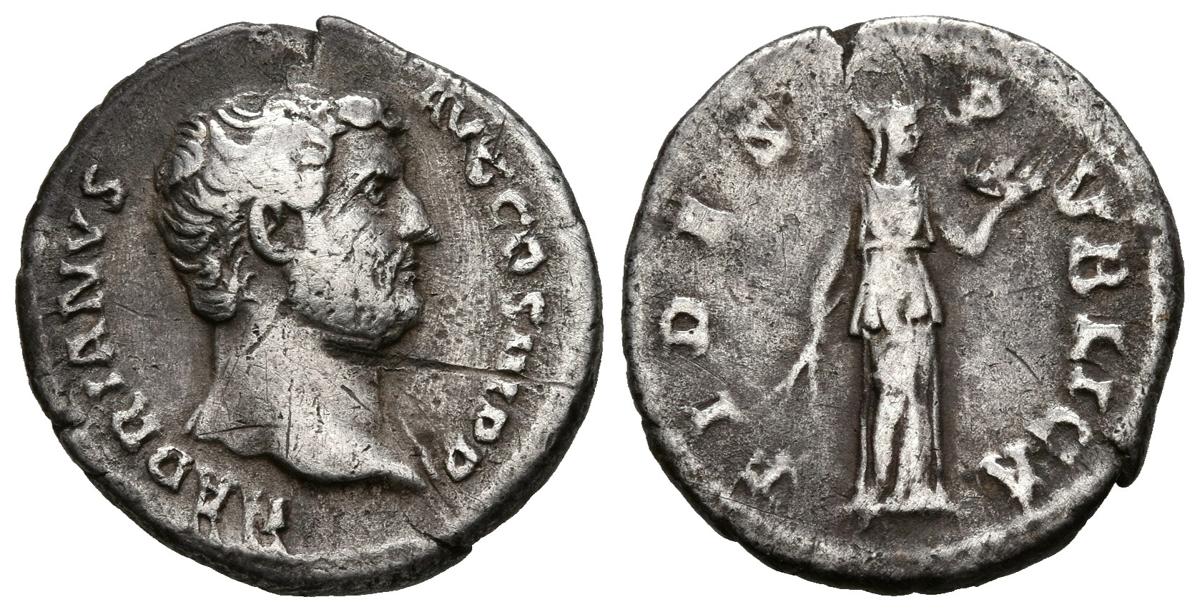 HADRIAN. Denarius. (Ar. 2.70g / 18mm). 136 AD Rome. (RIC 241Aa). Anv: Hadrian's head on the right, around legend: HADRIANVS AVG COS III P P. Rev: Fides standing on the right carrying grains and fruit plate, around legend: FIDES PVBLICA. Very Fine.