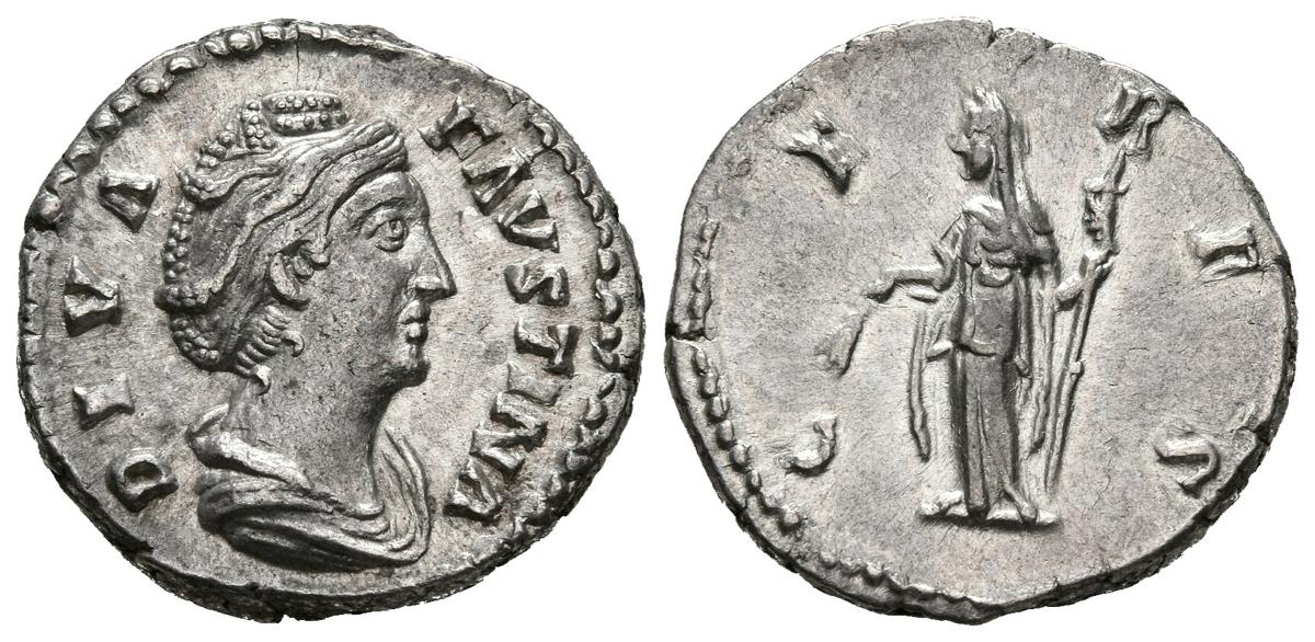 English FAUSTINA I. Denario. (Ar. 3.41g / 18mm). 140-141 AD Rome. (RIC 378). Anv: Diademic and draped bust of Faustina I on the right, around the legend: DIVA FAVSTINA. Rev: Ceres standing on the left carrying beads and scepter, around legend: CERES. Extremely Fine. Remnants of original shine. Nice specimen.