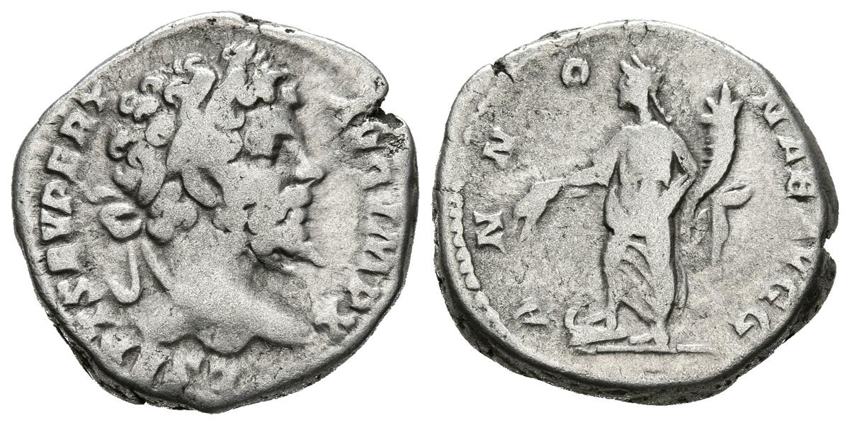 English SEPTIMIUS SEVERUS. Denarius. (Ar. 3.23g / 17mm). 197-198 AD Rome. (RIC 107). Anv: Laureate head of Septimius Severus on the right, around legend: L SEPT SEV PERT AVG IMP X. Rev: Annona on the bow carrying grain and cornucopia, around legend: ANNONAE AVGG. Almost Very Fine.