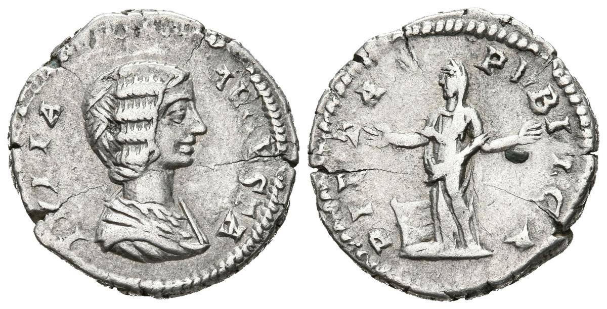 JULIA DOMNA. Denarius. (Ar. 3.28g / 18mm). 200-207 AD Rome. (RIC 574). Anv: Diademic and draped bust of Julia Domna on the right, around legend: IVLIA AVGVSTA. Rev: Pietas left standing carrying patera on altar and raising left hand, around legend: PIETAS PVBLICA. Very Fine.