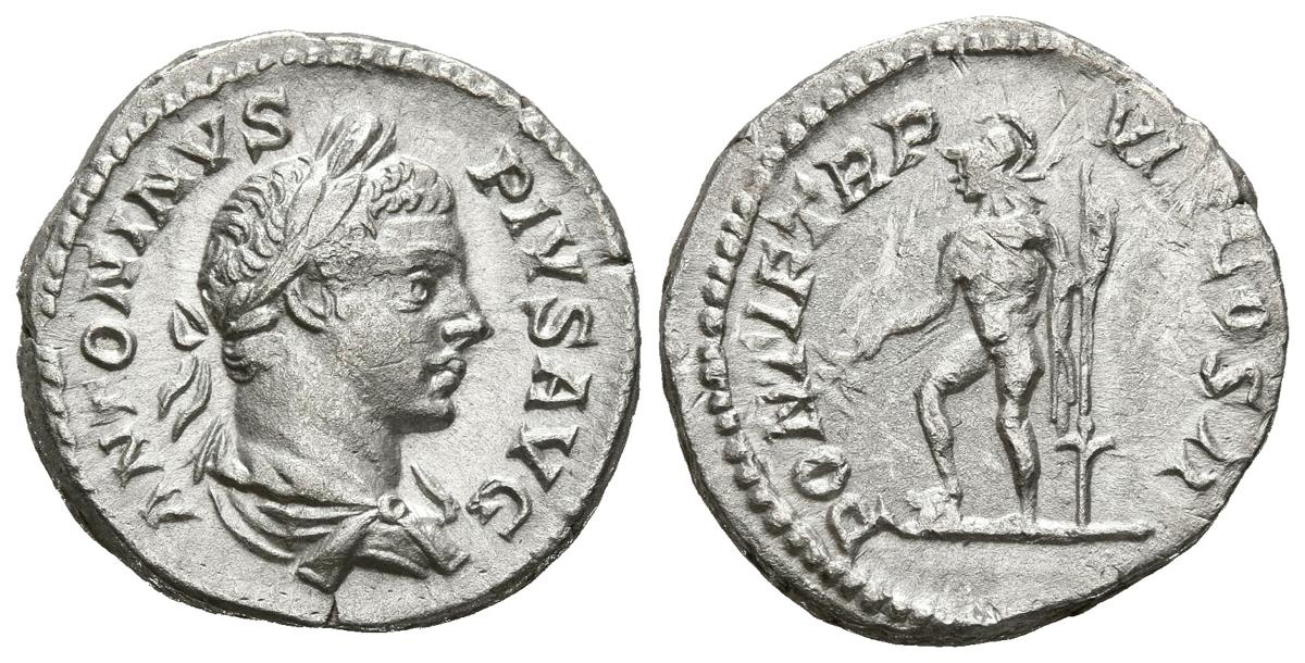 CARACALLA. Denarius. (Ar. 2.98g / 18mm). 205 AD Rome. (RIC 80b). Anv: Laureate, draped and cuirass bust of Caracalla on the right, around the legend: ANTONINVS PIVS AVG. Rev: Mars standing to left carrying spear and branch, around legend: PONTIF TR P VIII COS II. Good Very Fine/ Very Fine.
