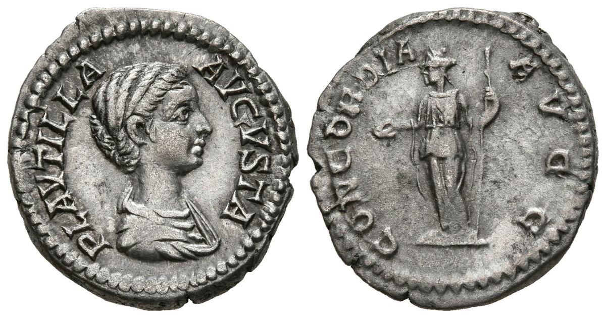 PLATE. Denarius. (Ar. 3.19g / 20mm). 202-205 AD Rome. (RIC 363a). Anv: Draped bust of Plautilla on the right, around legend: PLAVTILLA AVGVSTA. Rev: Concordia standing to the left carrying patera and scepter, around legend: CONCORDIA AVGG. Good Very Fine/ Very Fine.