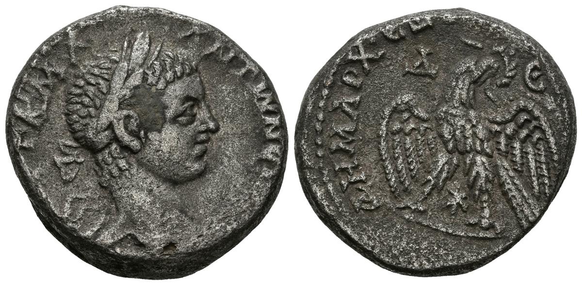 English ELAGABALUS. Tetradrachm. (Ar. 14.67g / 25mm). 219 AD Antioch. (McAlee 761). Anv: Laureate head of Heliogabalus on the right, around legend. Rev: Aguila standing on the right with laurel wreath, between AE, below star, around legend. Almost Very Fine.