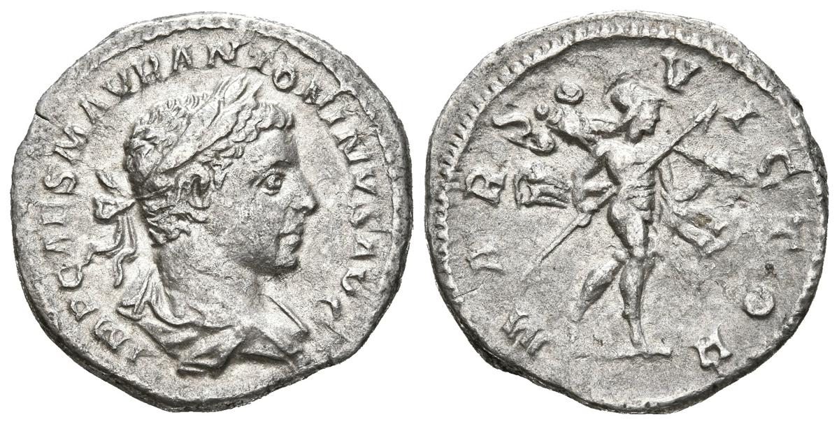 English ELAGABALUS. Denarius. (Ar. 2.63g / 20mm). 219 AD Rome. (RIC 123). Anv: Laureate and draped bust of Heliogabalus on the right, around the legend: IMP CAES M AVR ANTONINVS AVG. Rev: Mars advancing to the right carrying trophy and spear. Very Fine.