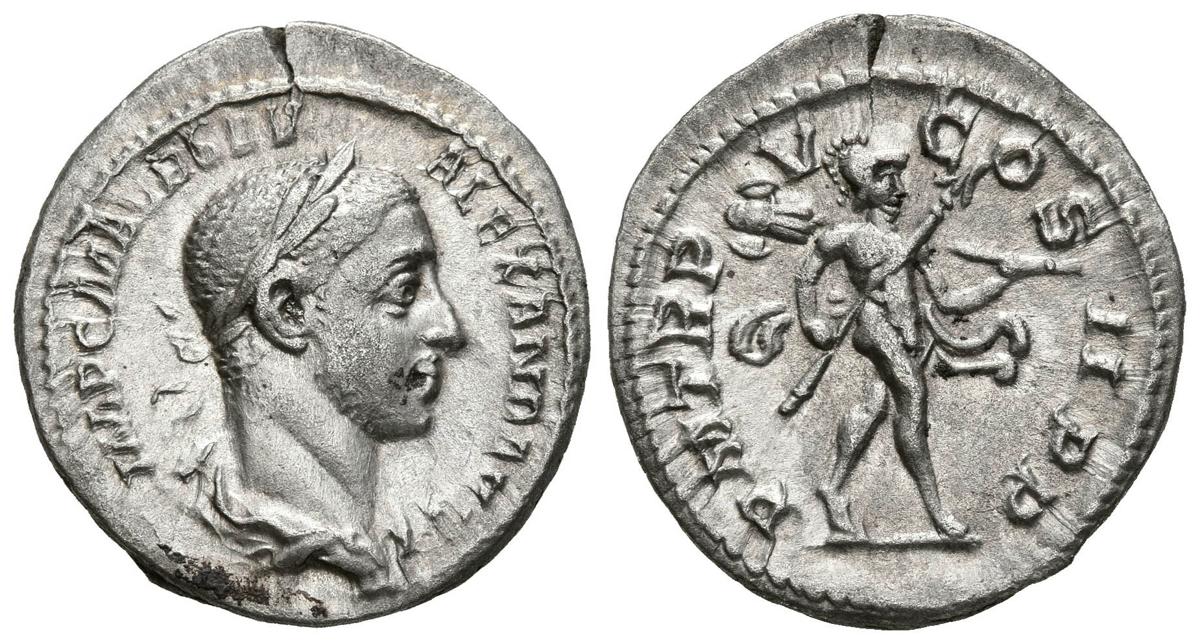 English SEVERUS ALEXANDER. Denarius. (Ar. 2.82g / 21mm). 226 AD Rome. (RIC 53). Anv: Laureate and draped bust of Alejandro Severo on the right, around the legend: IMP CM AVR SEV ALEXAND AVG. Rev: Mars advancing to the right carrying spear and trophy, around legend: PM TR PV COS II P P. Good Very Fine.