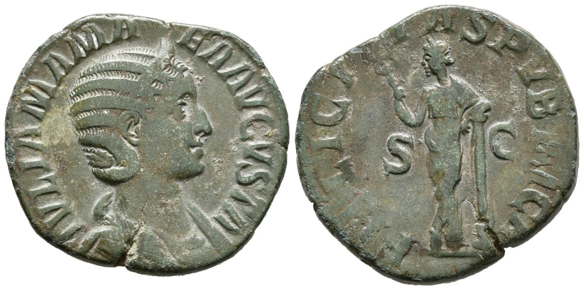 JULIA MAMEA. Sesterce. (Ae. 14.02g / 29mm). 228 AD Rome. (RIC 676). Anv: Draped and laureate bust of Julia Mamea on the right, around legend: IVLIA MAMAEA AVGVSTA. Rev: Felicitas standing on the left carrying caduceus and leaning on column, between Uncirculated, around legend: FELICITAS PVBLICA. Almost Very Fine. Green patina.