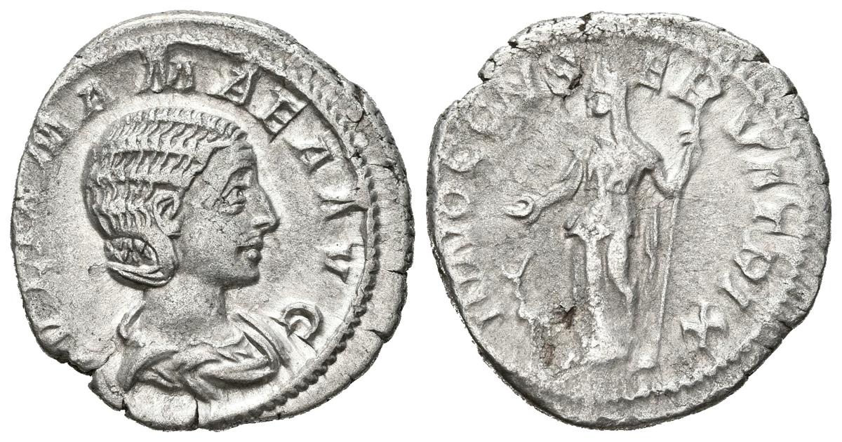 JULIA MAMEA. Denarius. (Ar. 2.63g / 19mm). 222-235 AD Rome. (RIC 343). Anv: Draped bust of Julia Mamea on the right, around legend: IVLIA MAMAEA AVG. Rev: Juno left standing carrying patera and scepter, at her feet peacock, around legend: IVNO CONSERVATRIX. Very Fine.