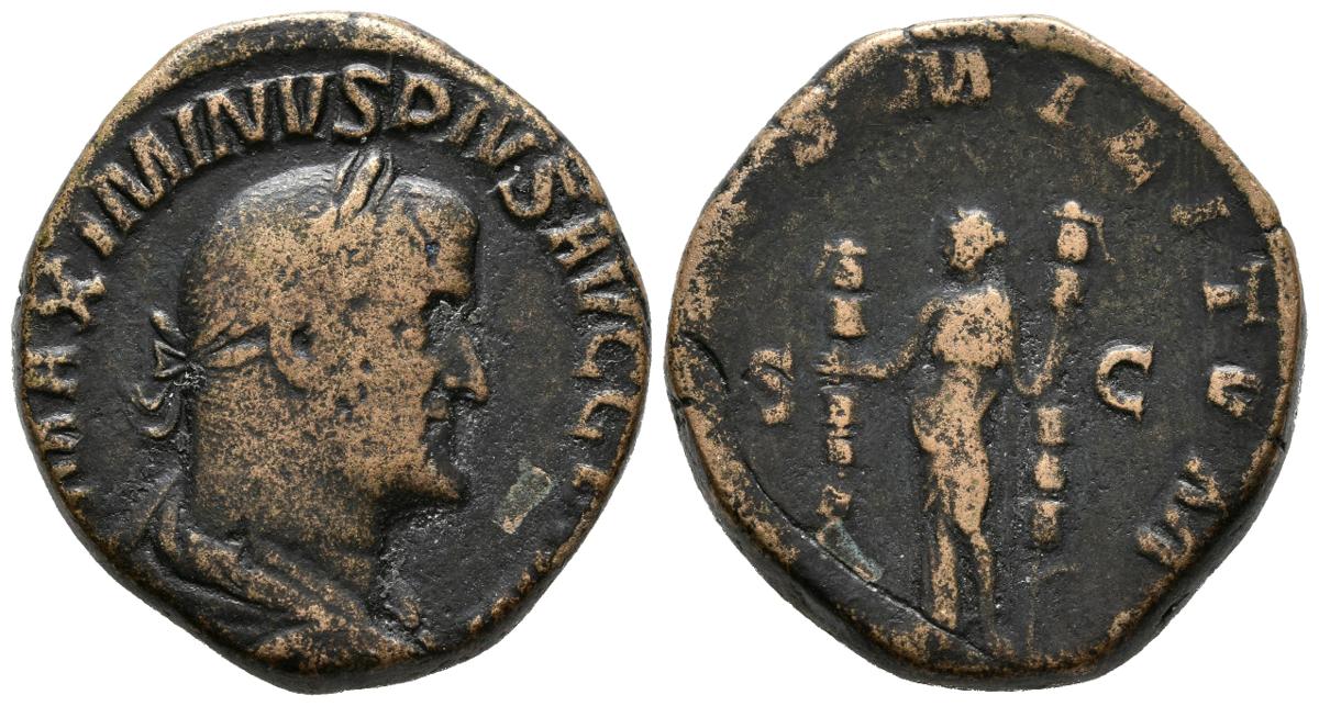 MAXIMINUS I. Sestercio. (Ae. 20.79g / 28mm). 236-238 AD Rome. (RIC 78). Anv: Laureate and draped bust of Maximinus I on the right, around legend: MAXIMINVS PIVS AVG GERM. Rev: Fides left standing carrying two banners, between Uncirculated, around legend: FIDES MILITVM. Almost Very Fine.