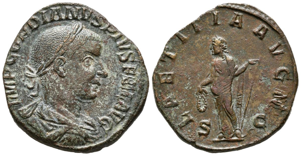 GORDIAN III. Sesterce. (Ae. 17.50g / 31mm). 241-244 AD Rome. (RIC 300a). Anv: Draped and laureate bust of Gordiano III on the right, around legend: IMP GORDIANVS PIVS FEL AVG. Rev: Laetitia standing to left carrying scepter and laurel wreath, between Uncirculated, around legend: LAETITIA AVG N. Very Fine/ Good Very Fine.