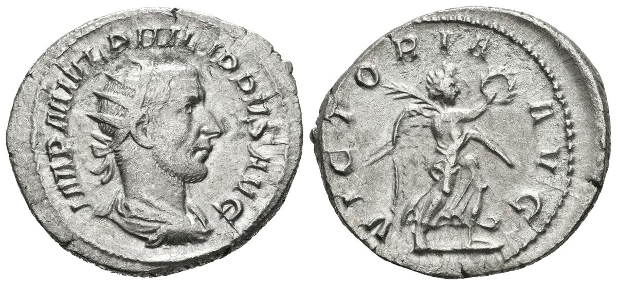 FILIPO I. Antoniniano. (Ar. 4.19g / 24mm). 244-247 AD Rome. (ICR 49b). Anv: Radiated and draped bust of Philip I on the right, around legend: IMP M IVL PHILIPPVS AVG. Rev: Victoria advancing to the right wearing palm and laurel wreath, around legend: VICTORIA AVG. Almost Very Fine.
