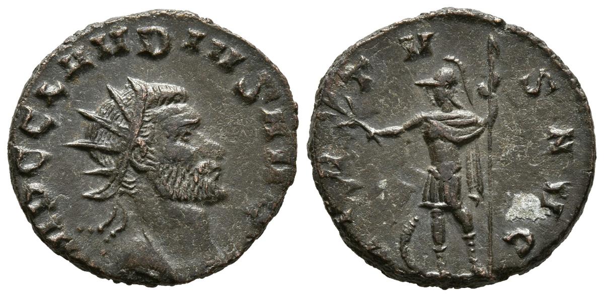 CLAUDIUS II. Antoninian. (Ae. 3.33g / 20mm). 268-270 AD Rome. (RIC 109). Anv: Bust radiated, draped and with cuirass to the right, around legend: IMPC CLAVDIVS AVG. Rev: Virtus standing on the left carrying branch and spear, at his feet shield, around legend: VIRTVS AVG. Almost Extremely Fine.
