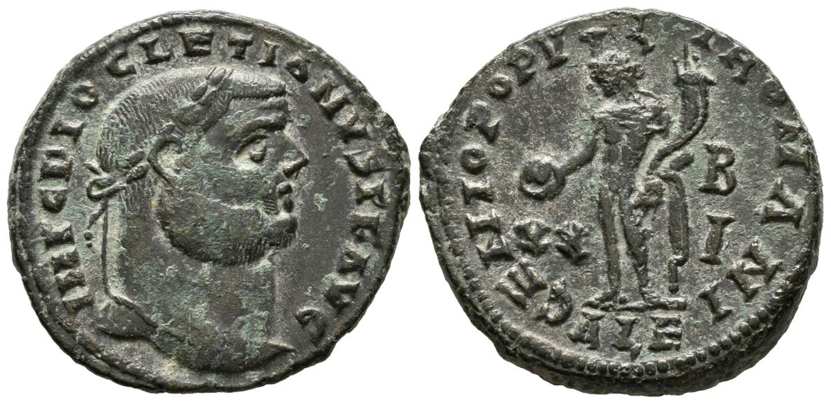 English DIOCLETIAN. Follis. (Ae. 9.82g / 27mm). 301 AD Alexandria. (ICR 32a). Anv: Laureate head of Diocletian on the right, around legend: IMP C DIOCLETIANVS PF AVG. Rev: Genius standing left carrying patera and cornucopia standing left, in the field: B / XX-I, in exergue: ALE, around legend: GENIO POPVLI ROMANI. Good Very Fine.