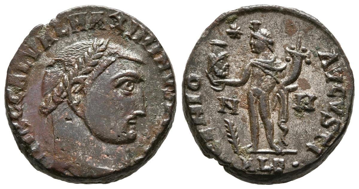 English MAXIMINUS II. Follis. (Ae. 4.91g / 20mm). 312-313 AD Alexandria. (IQR 160 var). Anv: Laureate head of Maximinus II on the right, around legend: IMP C GAL VAL MAXIMINVS PF AVG. Rev: Genius standing to the left carrying the head of Serapis and cornucopia, at its feet branch, in field NN, in exergue: ALE, around legend: GENIO AVGVSTI. Good Very Fine.