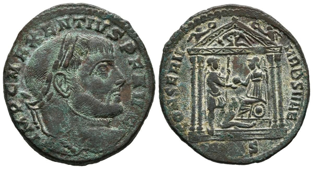 MAJENCIO. Follis. (Ae. 6.82g / 27mm). 309-310 AD Aquileia. (RIC 121a). Anv: Laureate head of Maxentius on the right, around legend: IMP C MAXENTIVS PF AVG. Rev: Tetrastyle Temple, inside, Maxentius standing to right with spear, in front, Rome seated on shield carrying spear, captive among them, below: AQS, around legend: CONSERV VRB SVAE. Very Fine.