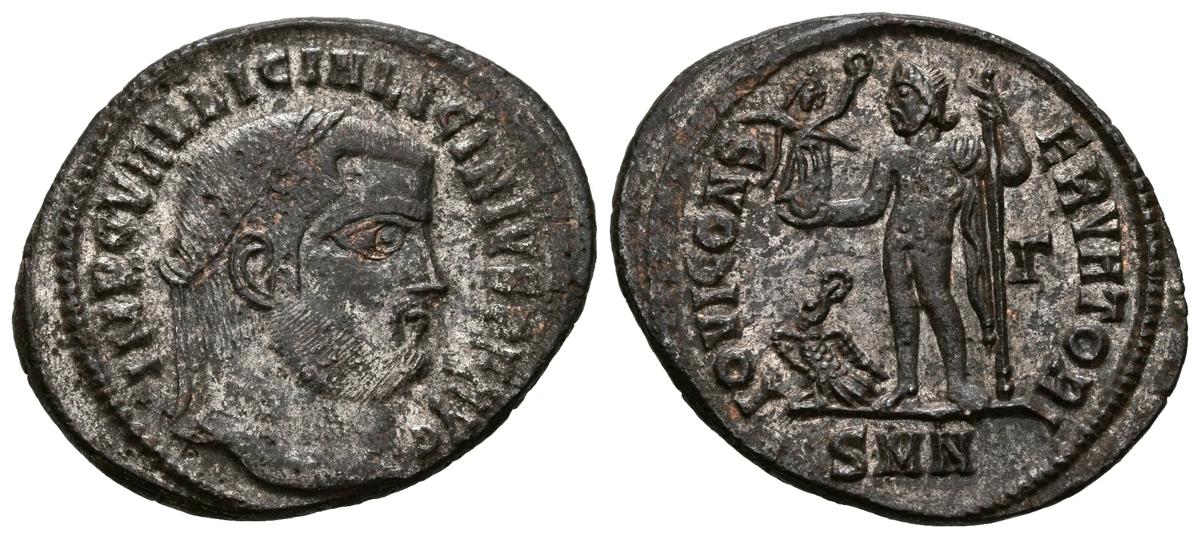 LICINIUS I. Follis. (Ae. 3.55g / 23mm). 311-317 AD Nicomedia. (RIC 13). Anv: Laureate head of Licinius I on the right, around legend: IMP C VAL LICIN LICINIVS PF AVG. Rev: Jupiter standing to left carrying Victoria with laurel wreath and banner, at his feet an eagle with laurel wreath, in field r, in exergue: SMN, around legend: IOVI CONSERVATORI. Good Very Fine. Remains of original silver.