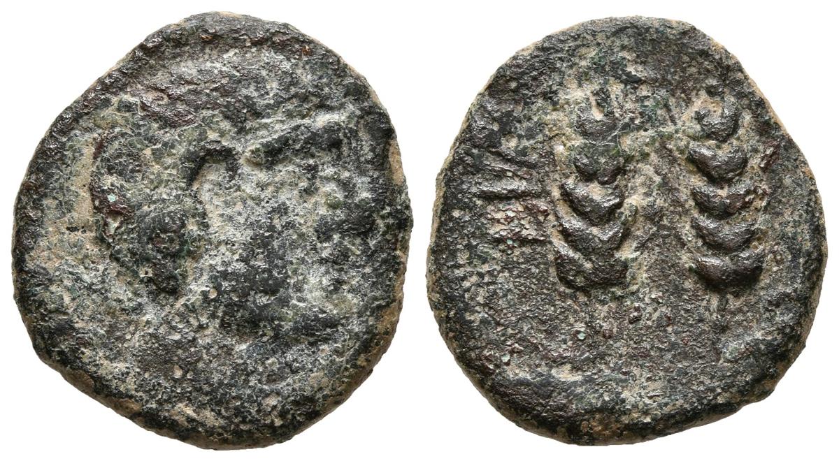 TINGIS, Mauritania. Be19. (Ae. 3.21g / 19mm). 2nd century-1st century BC (SNG Copenhagen 732). Anv: Male head to the right. Rev: Two spikes. Good Fine/ Almost Very Fine.