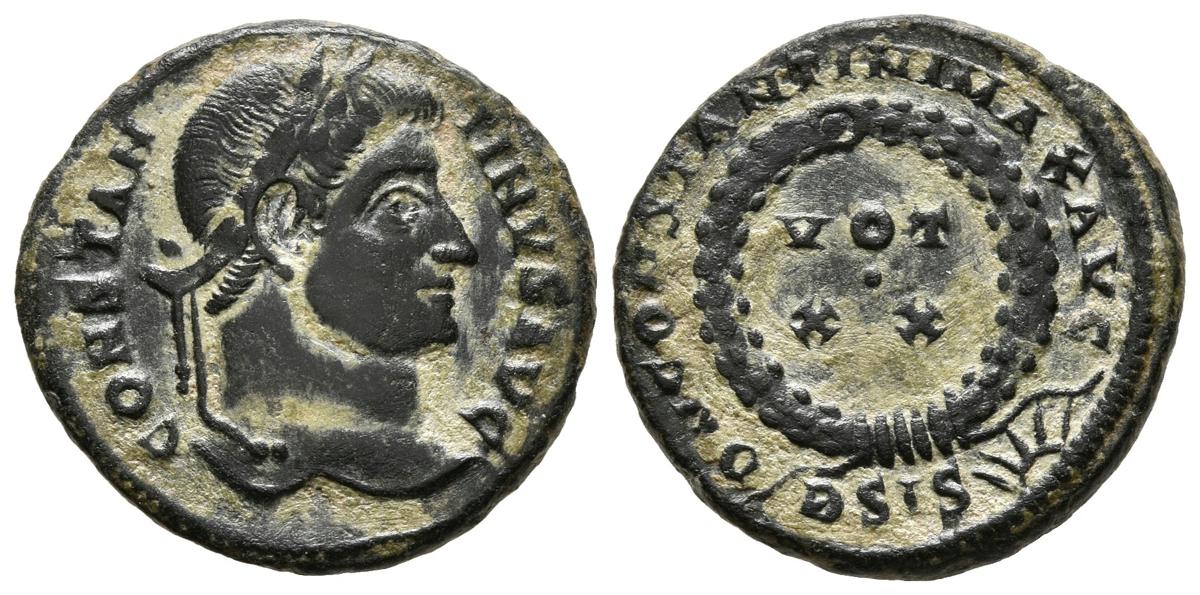 CONSTANTINE II. Follis. (Ae. 3.44g / 19mm). 321-324 AD Siscia. (RIC 180). Anv: Diademic head of Constantine II on the right, around legend: CONSTANTINVS AVG. Rev: Legend: VOT XX, inside laurel wreath, below: BSIS, around legend: DN CONSTANTINI MAX AVG. Very Fine.