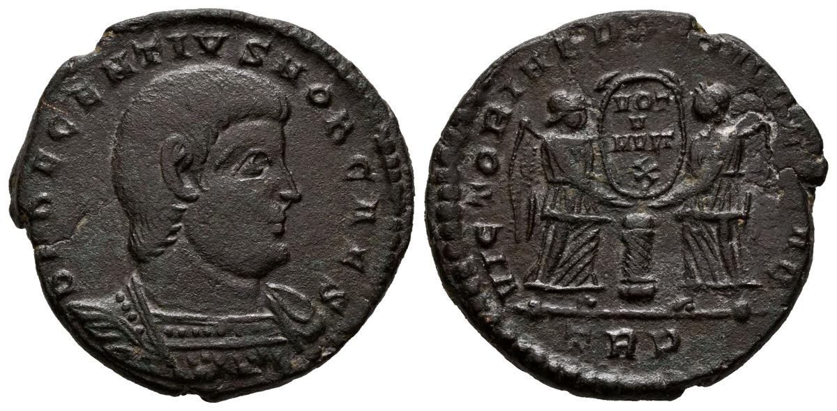 DECENT. Maiorina. (Ae. 5.39g / 22mm). 351 AD Trier. (RIC 308). Anv: Bust with breastplate of Decentio on the right, around legend: DN DECENTIVS NOB CAES. Rev: Two Victories facing each other holding shield with inscription: VOT / V / MVLT / X, on altar, in exergue: TRP, around legend: VICTORIAE DD NN AVG ET CAE. Good Very Fine.